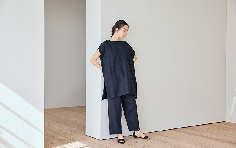 ラインアップは「チュニック」と「パンツ」。上下ともゆったりしたシルエットですがリネンならではの上品なツヤ感があり、きれいめに着こなしてもいただけます。