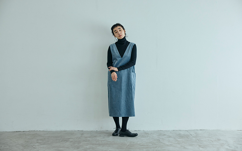 前も後ろも深くVが入った形で堅苦しさのないジャンパースカートは、下から履いても着られるような、リラックス感のあるデザイン。左右の大きなパッチポケットをアクセントにしました。