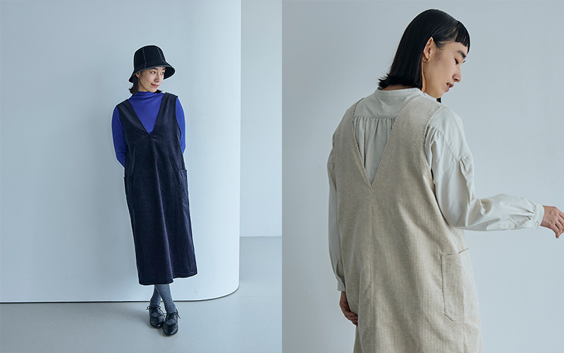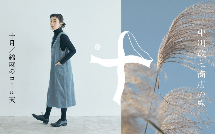 10月は「清秋」。残暑もようやく終わり、清く澄みわたる空に爽やかな秋を感じる月となりました。木々が色を染める景色や、遠くから聞こえる虫の声。そんな時季に着ていただけたらと、豊かな空気を吸い込んで出かけたくなるような服を、綿麻のコール天で作りました。