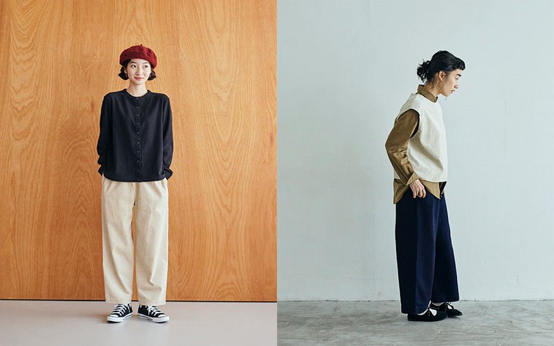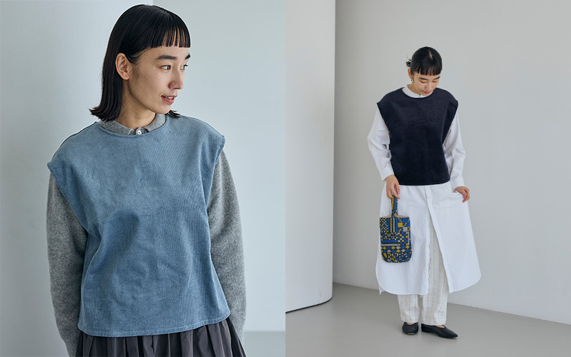 毎年人気で、中川政七商店でも秋の定番となっているこの生地を用いて、今シーズンは昨年から引き続きおつくりする「イージーパンツ」に加え、新たに「プルオーバーベスト」と「ジャンパースカート」をラインアップ。いずれも着まわしやすく、寒い季節まで長く着られるアイテムを揃えました。