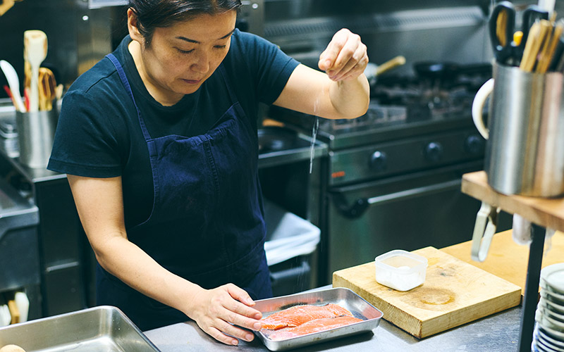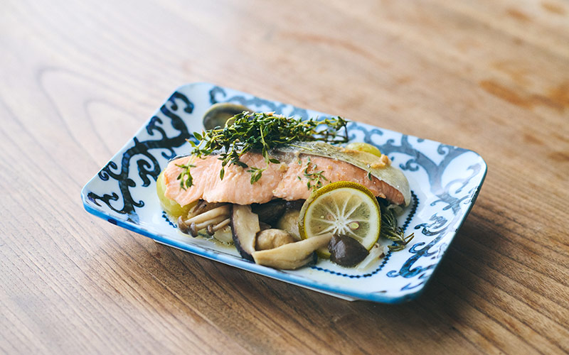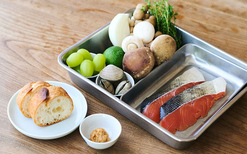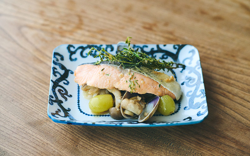 今月のレシピで主役にしたのは秋鮭です。昔、お世話になったお店でよく作られていた紙包み焼きを思い出し、私流のレシピにしてみました。だんだんと寒くなってくるこの時期に愉しめるよう、今回はきのこやあさり、マスカット、香草と合わせ、秋をぎゅっと包み込んでいます。