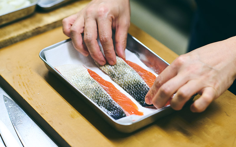 鮭の水分をペーパータオルで拭き取る。