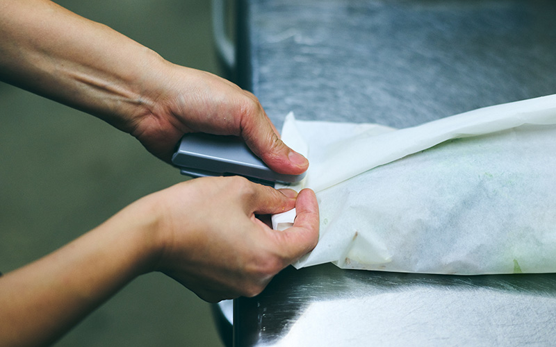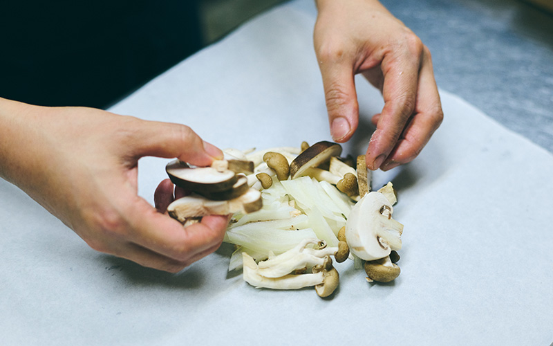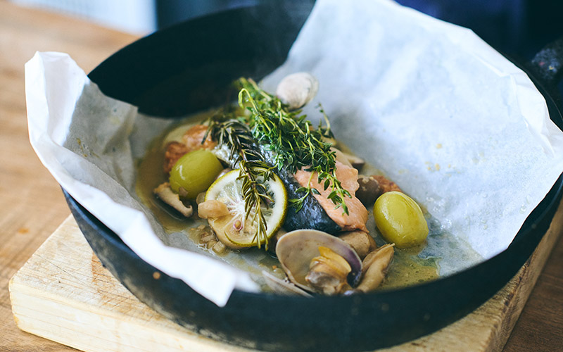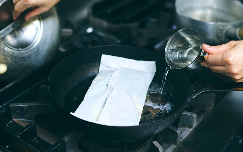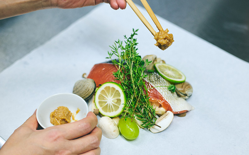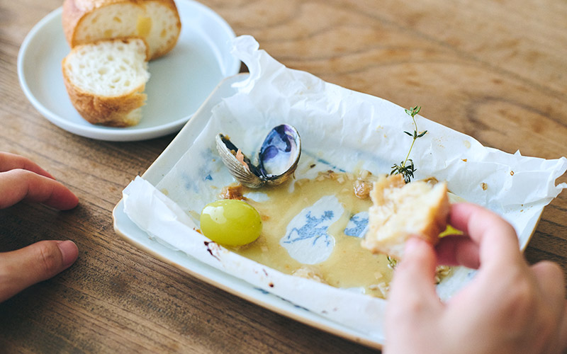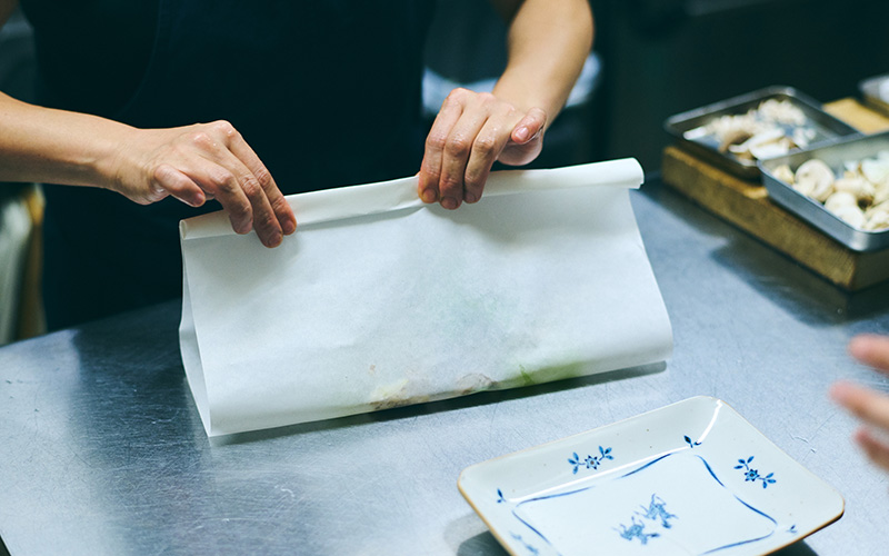 ポイントは少し大きめの紙を使い、なかの空間に空気を入れて、蒸し焼きのようなイメージで作ること。秋鮭はふっくらしっとり、きのこやあさりはおいしいスープを出してくれるといいなと思いながら作りました。