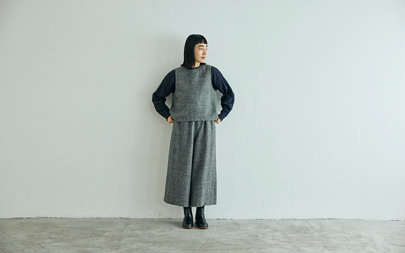「かぶりベスト」はその名のとおり、かぶって着られるベスト。後ろの襟元にボタンを一つつけてかぶりやすいよう調整し、パンツにもスカートにも合わせやすい絶妙な丈感に仕上げました。