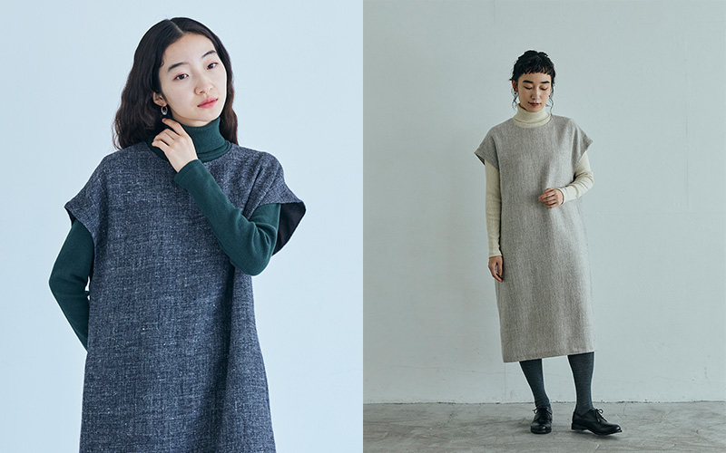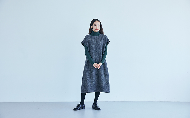 「ワンピース」は袖なしのゆるやかなAライン。身幅をゆったりととっていますが、広がり過ぎず、かわいらしさはやや抑えた形に仕上げています。こちらもカットソーやタートルネックに合わせて、冬の装いを楽しんでいただければと思います。