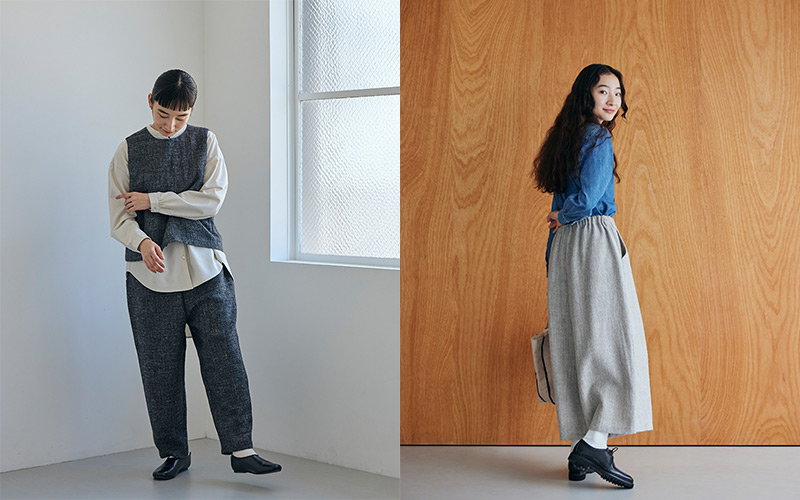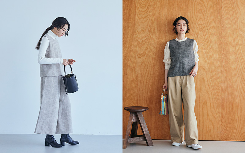 ラインアップは4種類。気温の差が激しい時期に心強い「かぶりベスト」や、ラクに履けつつ形のきれいな「テーパードパンツ」と「ワイドパンツ」、また冬の着こなしで活躍する「ワンピース」を揃えました。