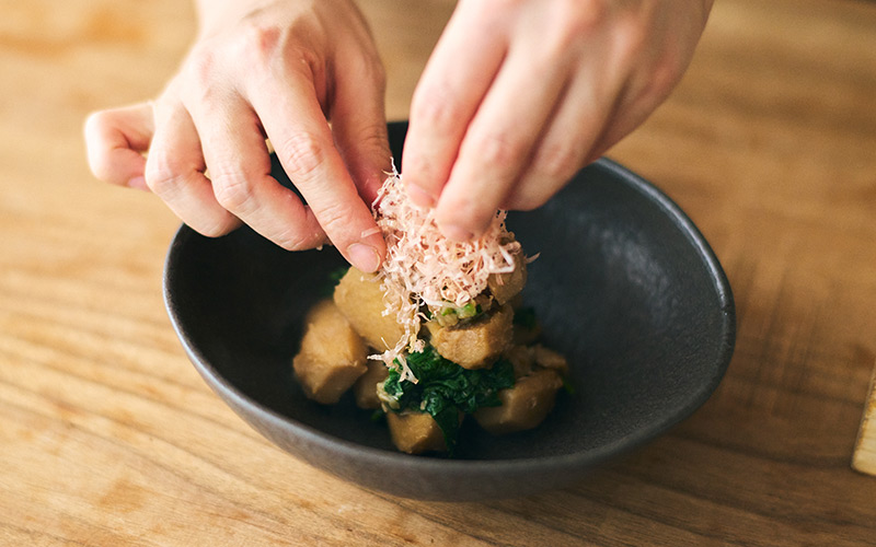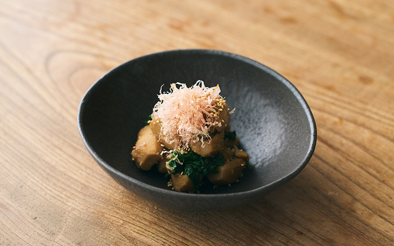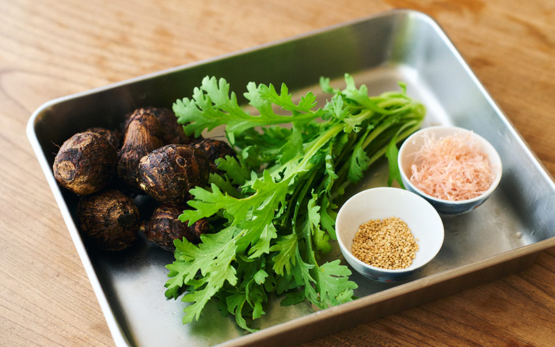 火を止めて鍋に春菊を入れ、軽く和える。うつわに里芋と春菊をバランスよく盛り付け、かつお節とごまをかけて完成!