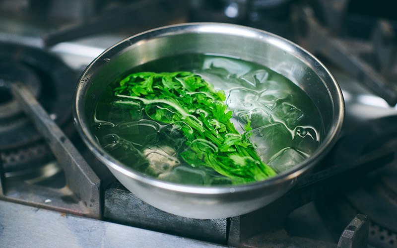 鍋に湯を沸かして塩(分量外)を入れ、春菊をサッとゆでる。茹でた春菊は冷水にとり、水気を絞っておく。