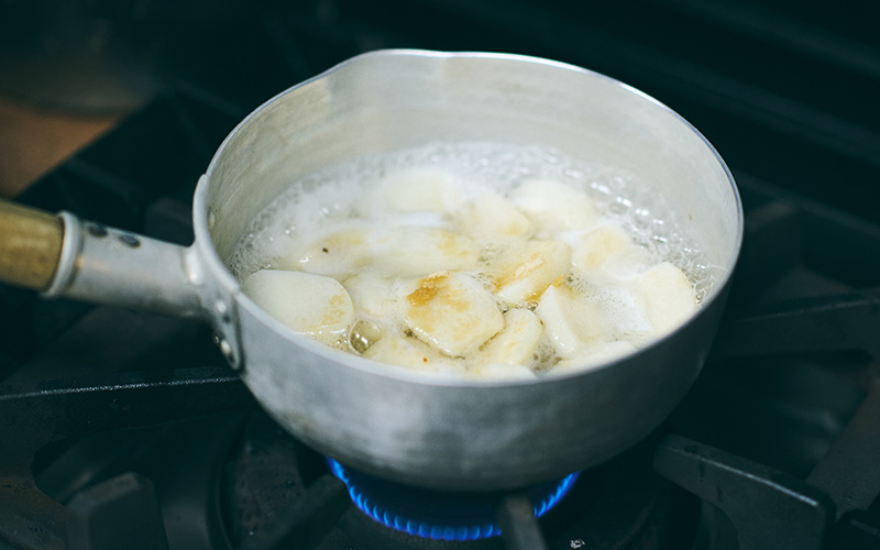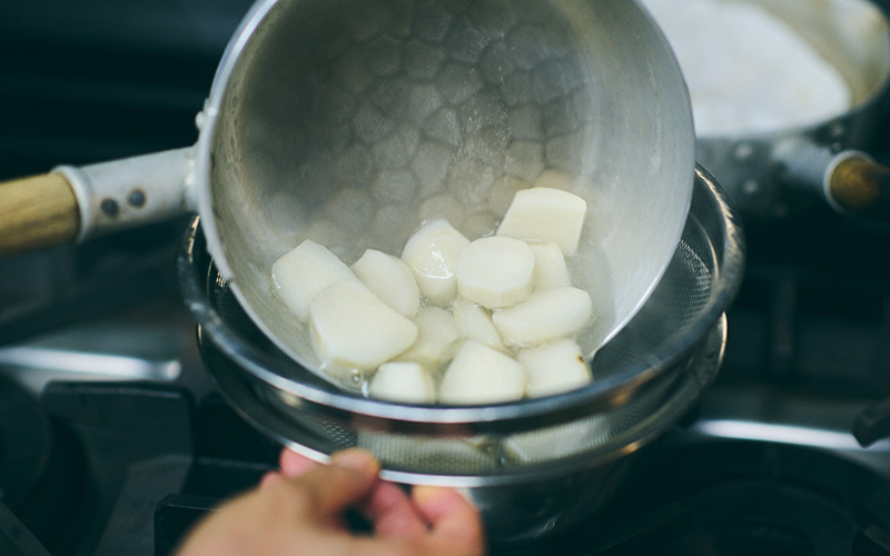 里芋の皮をむいて半分に切る。鍋にたっぷりの水とともに入れ、水から下茹でする。3割程度まで火が入ればOK。米のとぎ汁があるときは一緒に入れると、ぬめりやアクが取れやすくなるのでおすすめ。
