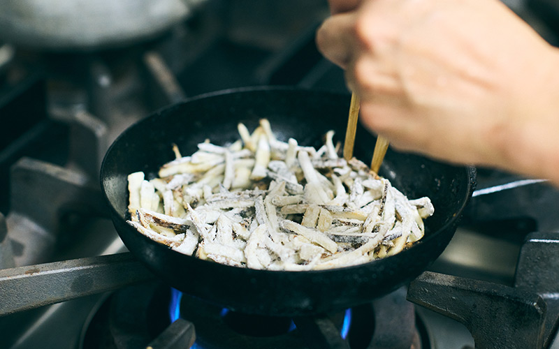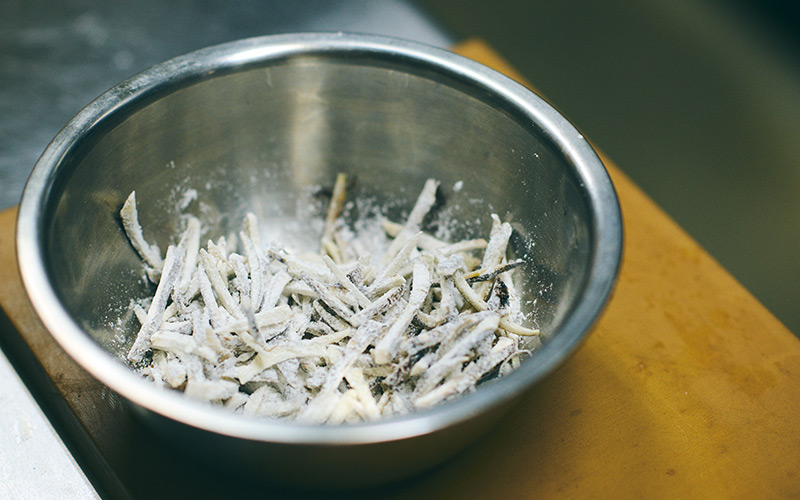 里芋の皮をよく洗って水けをふき、千切りする。片栗粉・米粉 各小さじ2、水小さじ1と一緒に入れてさっくりと絡める。