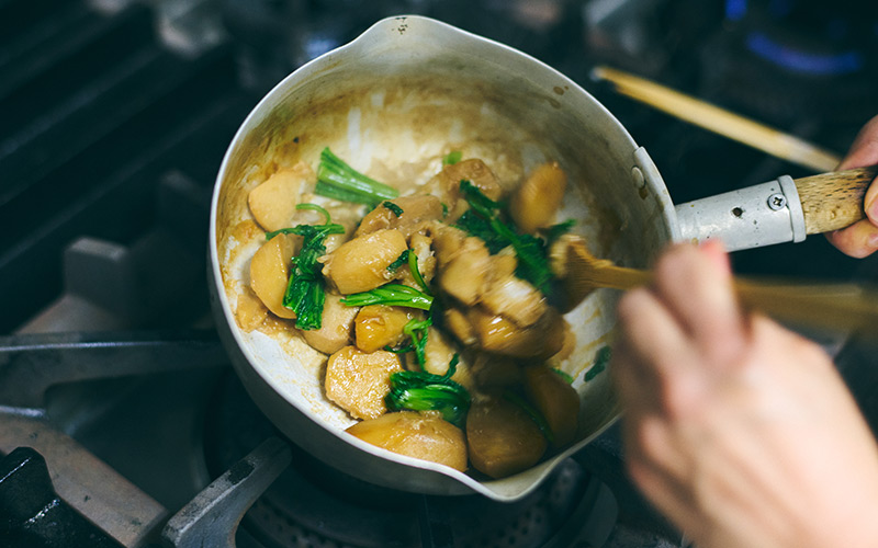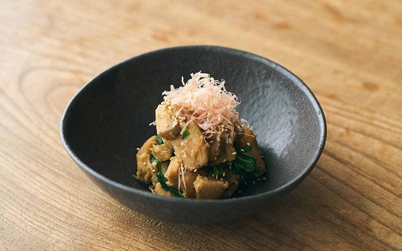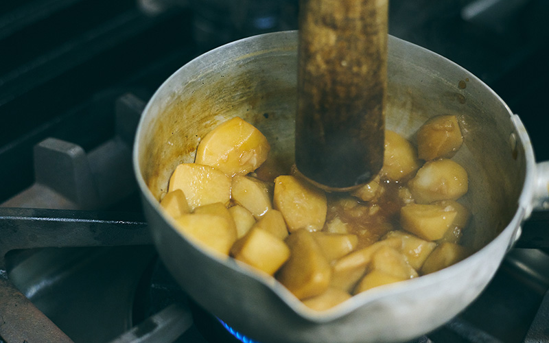煮ながら味をみて、お好みで醤油を足しさらに煮詰める。味がぼんやりするなと感じた場合は味噌を少し足すと、味が引き締まるのでおすすめ。煮汁が少なくなったら、里芋の半量を軽くつぶす。