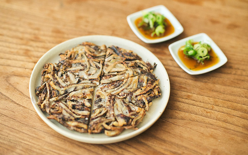 片面がカリッと焼けたら裏も同様に焼く。焼き上がった生地はピザ切りで6等分し、小ねぎを入れたぽん酢につけていただく。