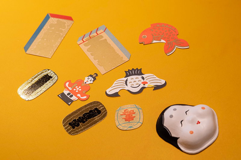「紙も、つるつるのものやざらざらのもの、金ぴかのものなどがあって。それぞれの紙で使う色の数を決めて、その中にモチーフをはめ込んで印刷をしてもらいました。紙が変わると発色も変わるので、同じ赤でも鯛のツヤが違って見える。そんな見え方なども一つひとつ調整しています」(長友さん)