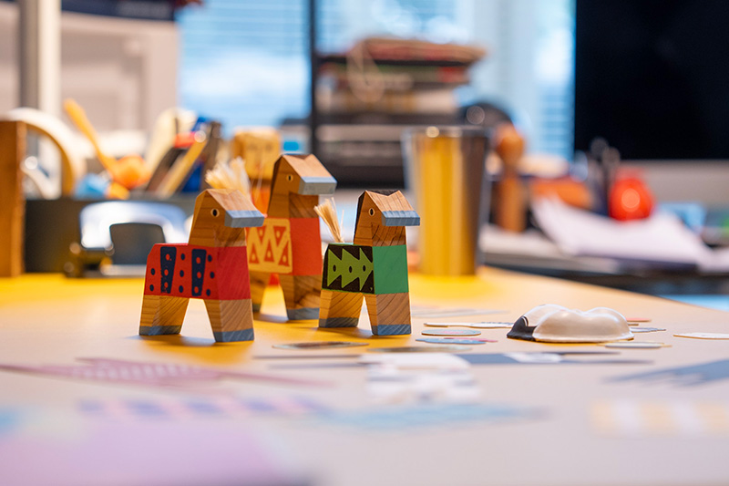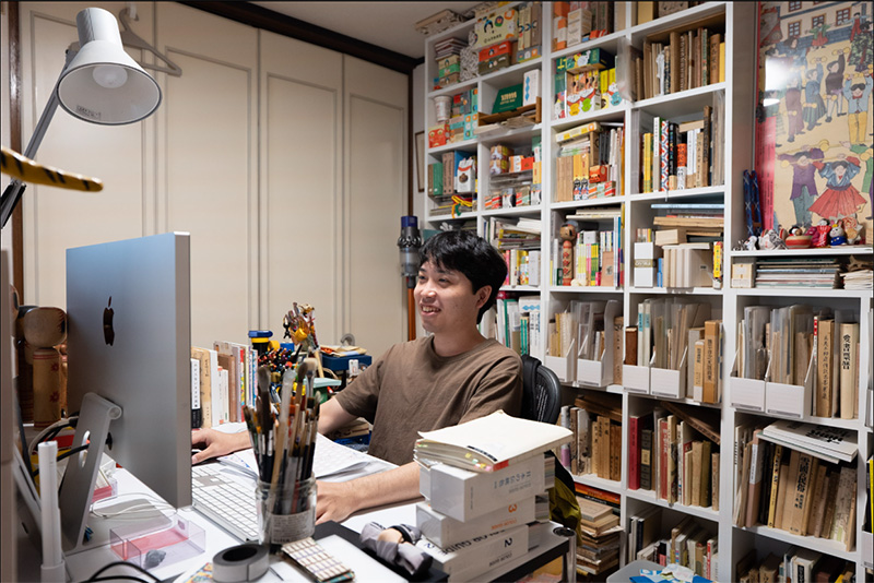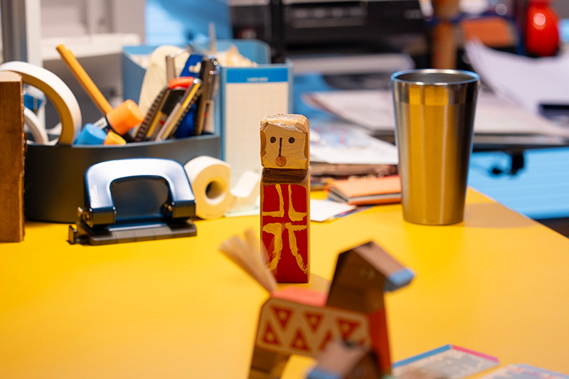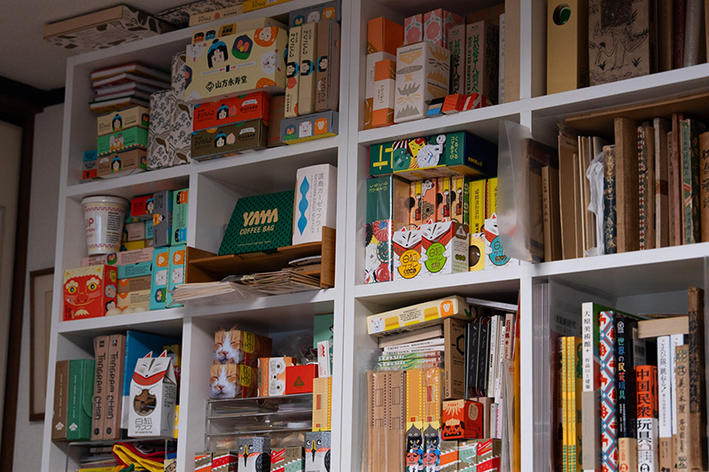 郷土玩具の魅力に惹かれ、「忘れられかけた伝統や地域に根ざした文化を発掘し、継承していきたい」との思いから“あそびのデザイン”をテーマに活動するCOCHAE。その仕事場には、壁一面の本棚にどこか懐かしくかわいらしい人形やパッケージが並び、紙や木などで作られた生き物たちが顔をのぞかせます。
