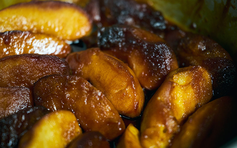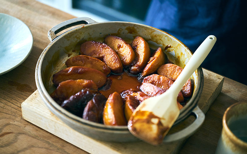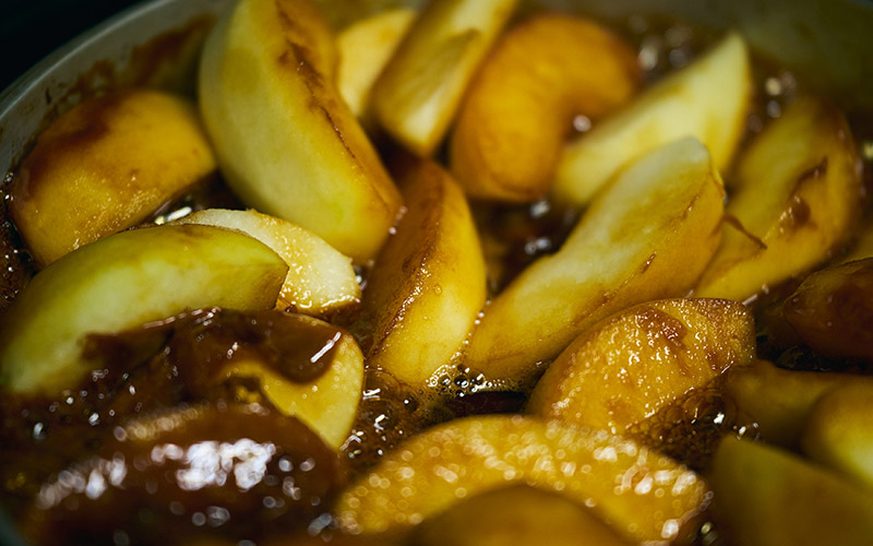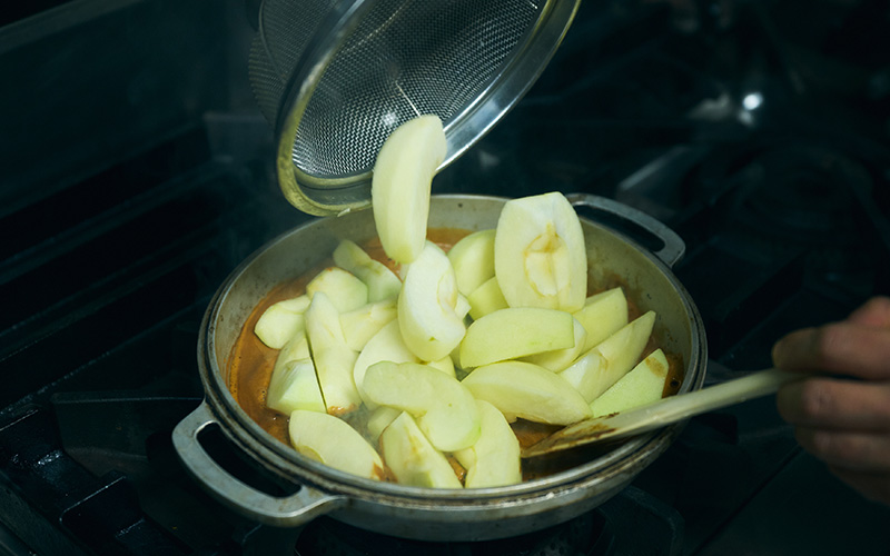 砂糖が濃いキャラメル色になったら一度火を止め、りんごを入れる。りんごにソースを絡め、全体がソースをまとったら再度弱火にかけて、時折ソースをかけながらじっくり火を入れていく。