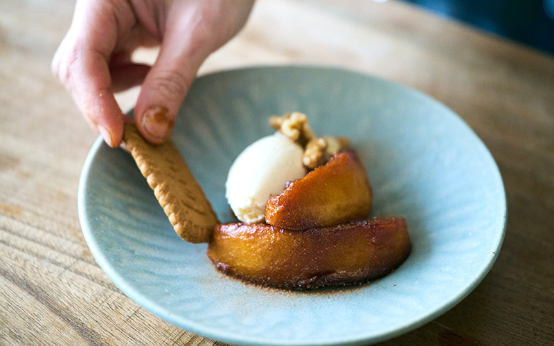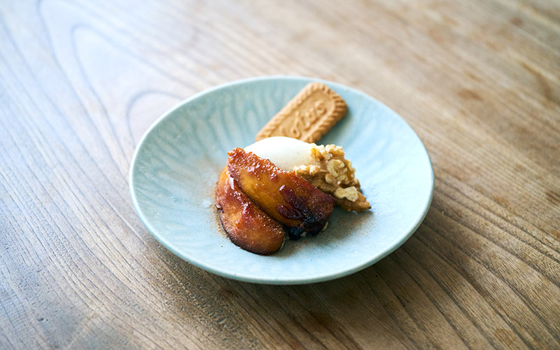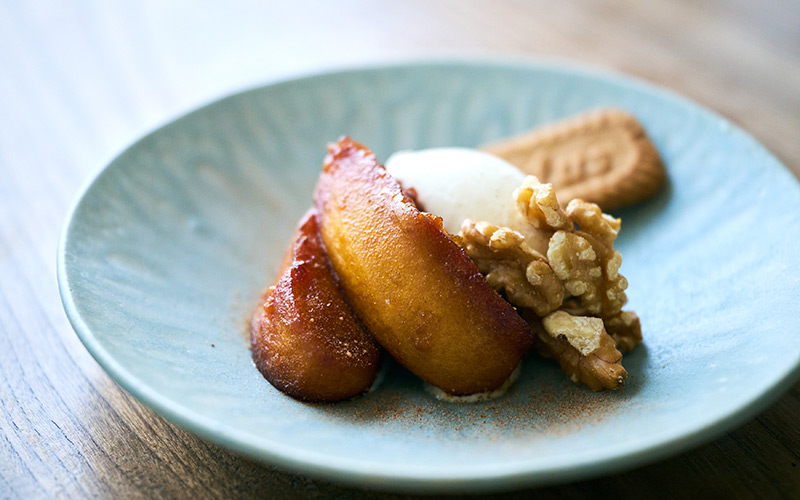 りんごがしんなりしたら火を止め、うつわに盛る。お好みのクッキーやナッツ、アイスクリームを添えて完成!