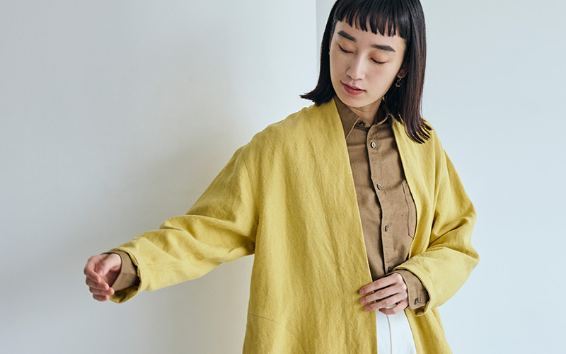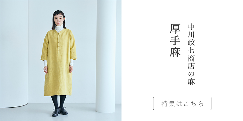 まだ寒さが残る季節に着たい、肉厚の生地である「厚手麻」。防寒と春気分の両方をかなえられるよう、重ね着することで冬から春まで活躍する素材感に仕上げました。一年を通して心地よく着られるため、シリーズが登場してから数年が経った今でもたくさんのご愛用の声を頂いています。