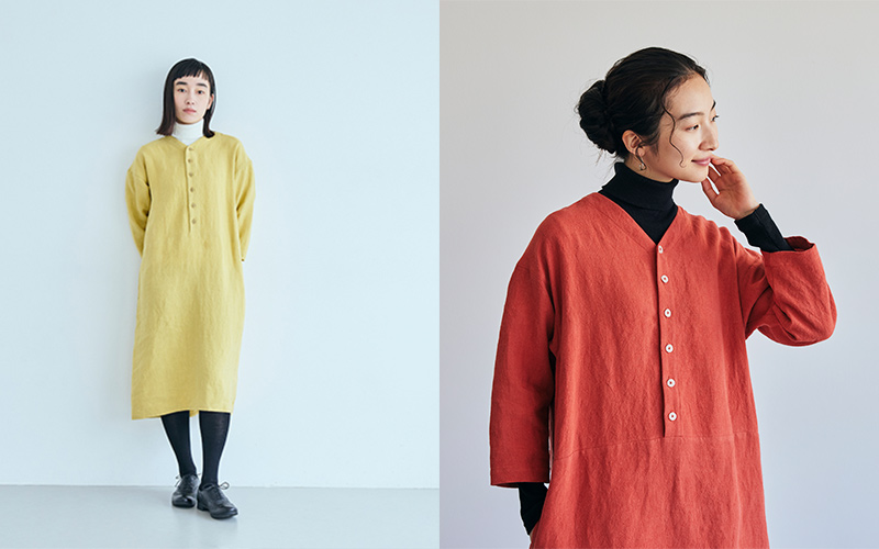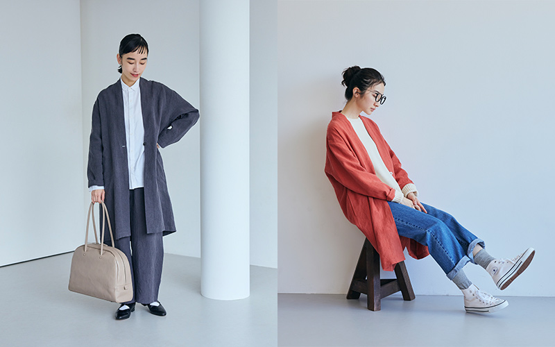 ラインアップは「ボタンワンピース」と「羽織コート」、「ワイドパンツ」の3種類。重ね着することで長い季節でお楽しみいただけるようにと、ゆったりめのシルエットにしています。