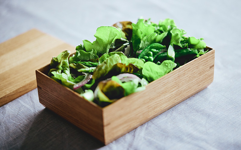 円形のうつわに盛り付けることが多いサラダですが、今回は四角に詰めることで、すっきりときれいに見せています。卓上の畑のような、遊び心がある見せ方です」