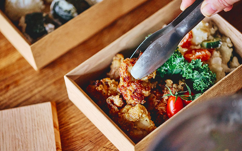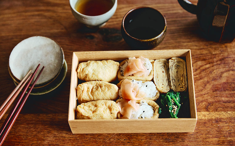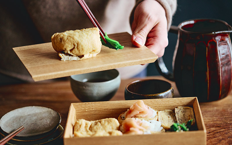 「定番セットはやはりご提案できたらなと思って、稲荷ずしをメインに玉子焼きと青菜のおひたしを添えました。少し大きめのお弁当箱のような使い方にしています。