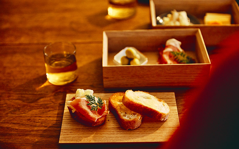 晩酌を凛と飾る「バケット、チーズ、ハム、オリーブ」