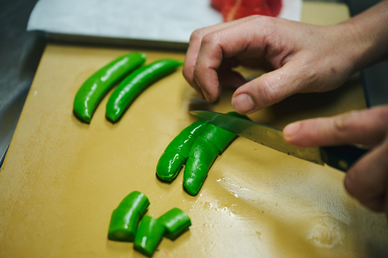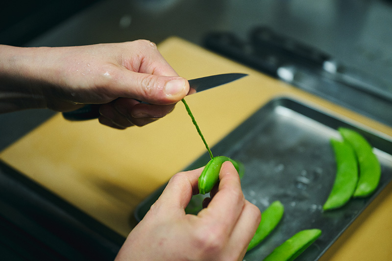 スナップえんどう豆を氷水から出し、食べやすい大きさに切る。