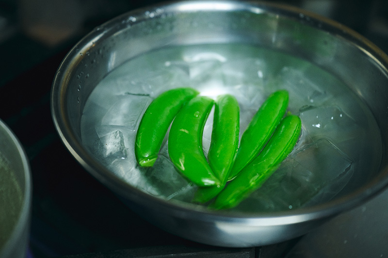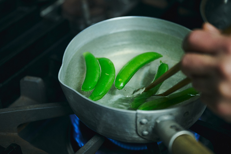 スナップえんどう豆は上下の筋を取り、2分ほど塩ゆで(塩は分量外)してから氷水に落としておく。
