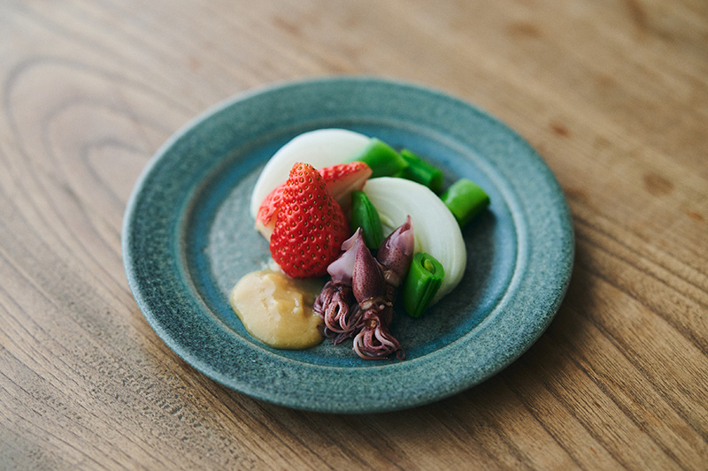 少し大きめの深みのあるお皿に盛りつけられていたのは、イカと八朔のひと品。マスタードと、上質なオリーブオイル、少し酸を効かせたそのソースに衝撃が走りました。「ソース持って帰りたいです!シェフ!」。
