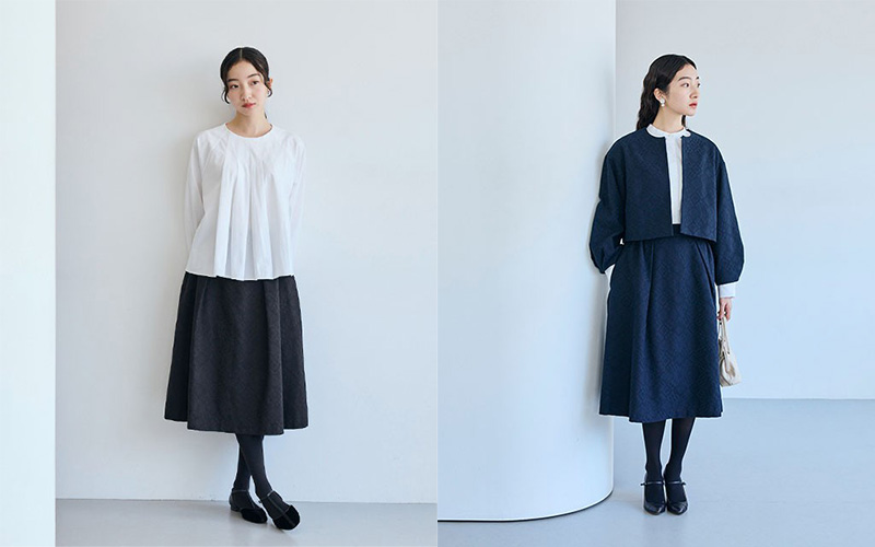 縁起の良い菱紋をジャカード織の繊細な陰影で表現した、ジャカード織の菱紋シリーズ。2025年にジャケットとワンピース、2026年にはジャケットとセットアップになるスカートが加わりました。
